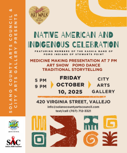 Join the communiy on Oct. 10th at City Arts Gallery in downtown Vallejo during the 2nd Friday Artwalk for a vibrant celebration of Native American and Indigenous Peoples. This celebration will highlight the traditions, history, and artistic achievements of Indigenous communities through traditional medicine making, art, music, storytelling, and hands-on activities.