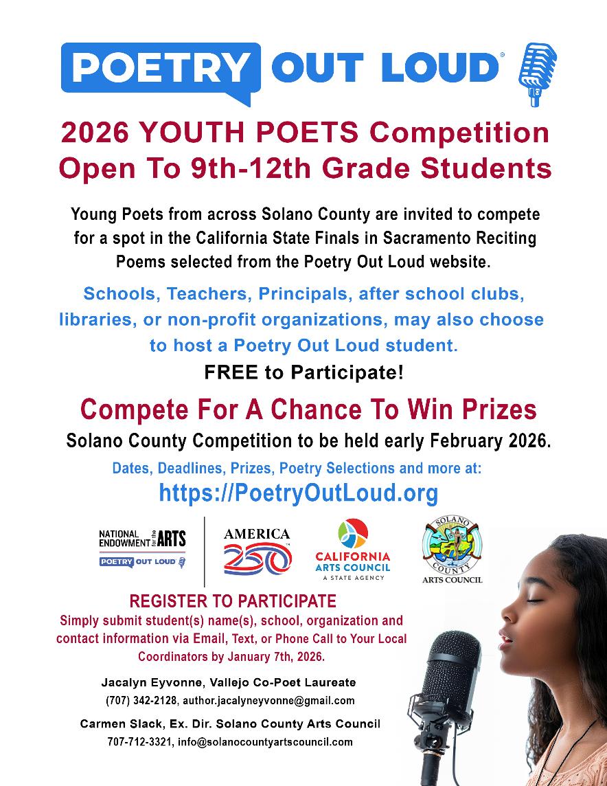 An initiative of the National Endowment for the Arts, administered statewide by the California Arts Council, Poetry Out Loud encourages high school students to learn about poetry through memorization, performance, and competition. Participants gain proficiency in public speaking, build self-confidence, and learn about literary history and contemporary life. California's Poetry Out Loud is the largest event of its kind in the U.S., and has grown steadily since its inception.